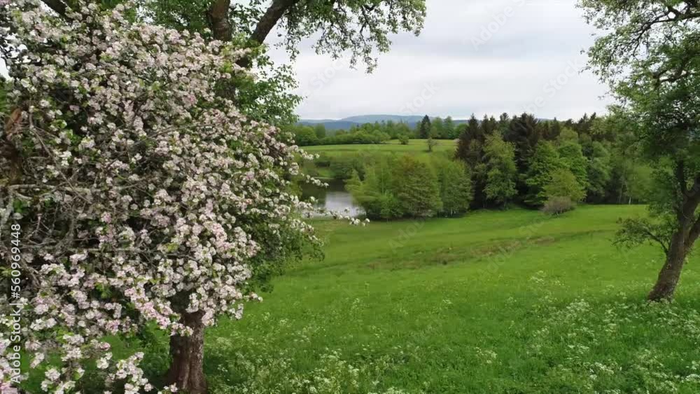 Sonniger Frühlingsmorgen in einem Kirschgarten