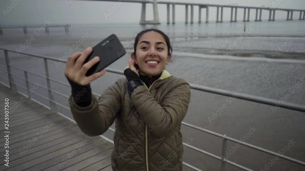 Frau, die selfie mit Smartphone nimmt.